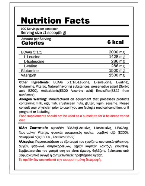 • BCAAs 5:1:1. Unique ratio of 5(Leucine):1(Isoleucine):1(valine)
