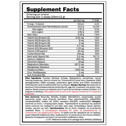 Our "Electrolytes" supplement is packed with potassium, magnesium, calcium, manganese, chromium & zinc to provide energy during intense workouts, while it contains many antioxidant Vitamins that help keep a healthy diet and reduce muscle stress, and a mix of carbs that provide the body with fuel in the right quantities and fight fatigue.