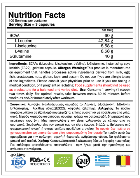 Extra BCAAs provide the most crucial amino acids for athletes and people that exercise. Each capsule contains:
