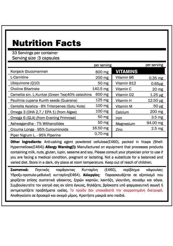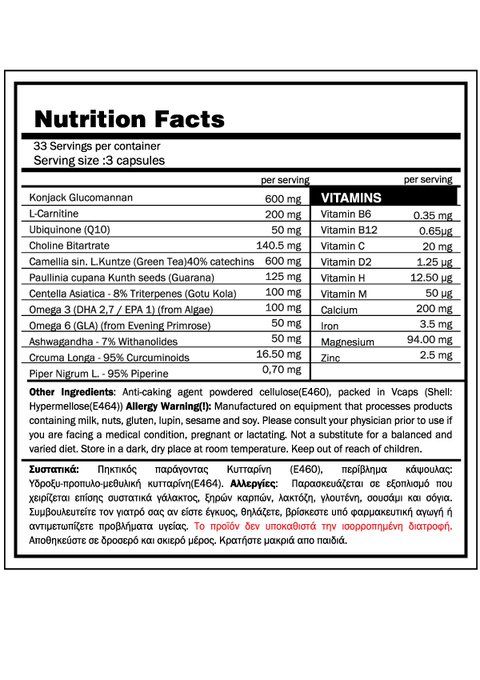 L- carnitine: transports fatty acids into the mitochondria. Once there, they can be used as fuel to generate adenosine triphosphate, or ATP. That means that L-carnitine not only increases the rate at which you burn fat, it can also provide a significant short-term increase in energy output, allowing you to train harder with greater endurance. Moreover it boosts the metabolism of carbs you consume from food and has antioxidant properties that help protect against free radical damage.