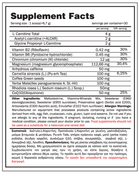 Fat killer has 2 g of Acetyl-L-carnitine and 2 g of Glycine Propionyl- L-Carnitine.