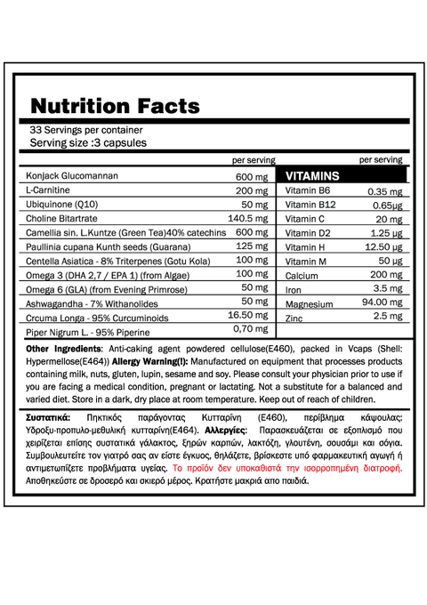L- carnitine: transports fatty acids into the mitochondria. Once there, they can be used as fuel to generate adenosine triphosphate, or ATP. That means that L-carnitine not only increases the rate at which you burn fat, it can also provide a significant short-term increase in energy output, allowing you to train harder with greater endurance. Moreover it boosts the metabolism of carbs you consume from food and has antioxidant properties that help protect against free radical damage.
