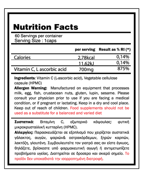 Pure Vitamin C (ascorbic acid), micro-encapsulated in Vegan capsule