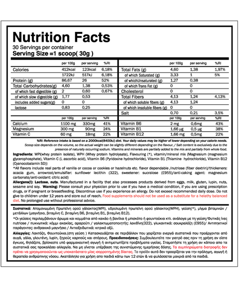 -85% of Whey Isolate (WPI 95%), a clean type of protein that undergoes multiple filtration levels to remove non-protein components such as fat, cholesterol and lactose, resulting in a 95% of real protein component.