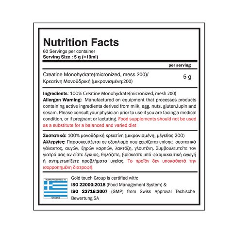 Creatine monohydrate is the most common type of creatine, in supplements, as well as the most researched. Lots of scientific evidence suggest that creatine monohydrate is a substance that works and many people that use it for the past 40 years, confirm those claims with the results they have seen in their bodies. Creatine is essentially an amine (literally a nitrogenous amino acid) that is naturally produced in our bodies by the amino acids: glycine, methionine and arginine (95% of our body’s creatine is stored in muscle cells). Moreover, creatine is also present in foods such as meat & seafood. What creatine as a nutrient actually doess, is to give your muscles more energy, during exercise, which increases the amount of work muscle cells can do. That means that your muscles are able to perform better and gradually are becoming stronger. This is a key factor in long-term muscle growth.