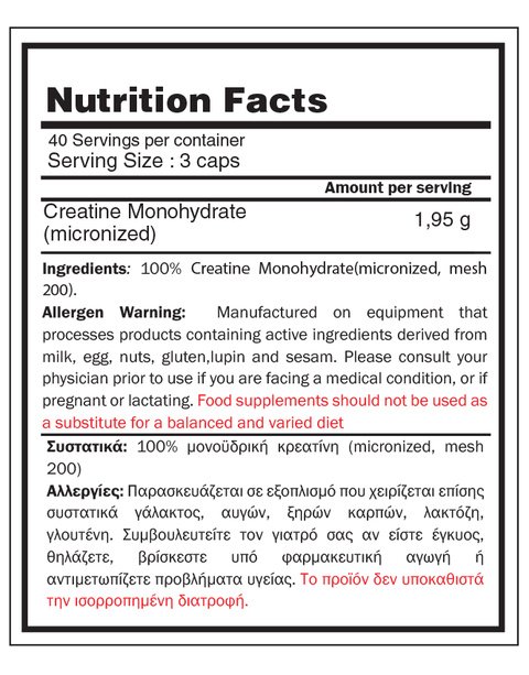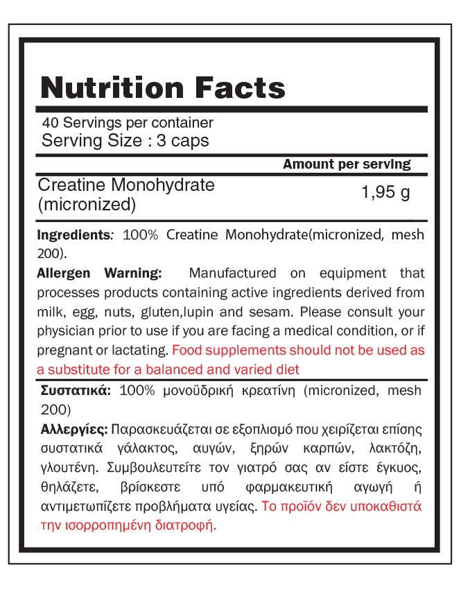 Creatine monohydrate is the most common type of creatine, in supplements, as well as the most researched. Lots of scientific evidence suggest that creatine monohydrate is a substance that works and many people that use it for the past 40 years, confirm those claims with the results they have seen in their bodies. Creatine is essentially an amine (literally a nitrogenous amino acid) that is naturally produced in our bodies by the amino acids: glycine, methionine and arginine (95% of our body’s creatine is stored in muscle cells). Moreover, creatine is also present in foods such as meat & seafood.